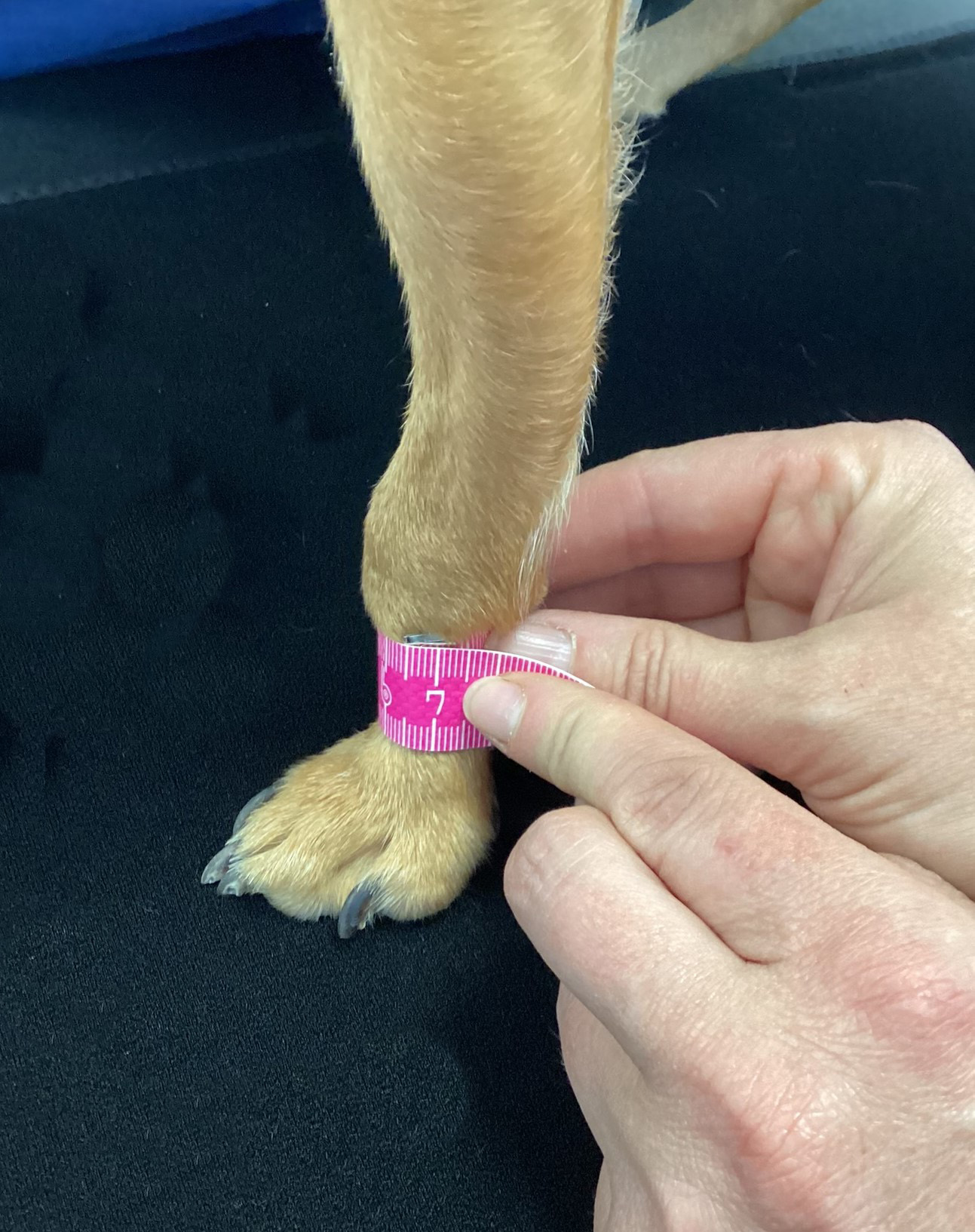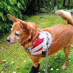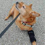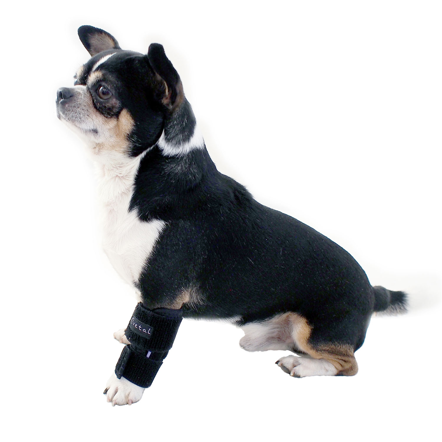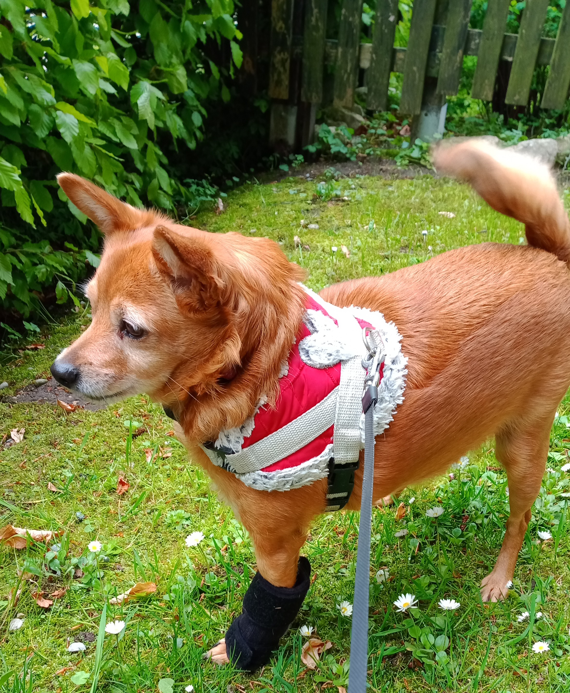 Versorgung einer dreibeinigen Hündin aus dem Tierschutz mit einer „Karpi stabil Karpalgelenkbandage“. Aufgrund der angeborenen Dreibeinigkeit kam es zu einer Überbelastung der Bänder und Sehnen des vorhandenen Vorderbeins. Daher bekam sie die „Karpi stabil Karpalgelenkbandage“ zur Unterstützung.
